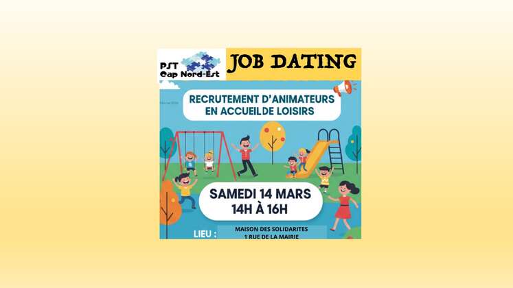 À l'approche des vacances de printemps et de la période estivale, la recherche d’animateurs qualifiés est un enjeu majeur pour notre association. C’est dans cette optique que les structures enfance et jeunesse du territoire organisent une après-midi de « Job Dating », le samedi 14 mars, de 14h à 16h.